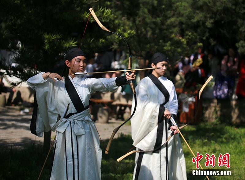 A grand archery ceremony was held in Suzhou, east China’s Jiangsu province to welcome the upcoming 57th World Table Tennis Championship on April 26, 2015. (Chinanews/Tang Yuwei)