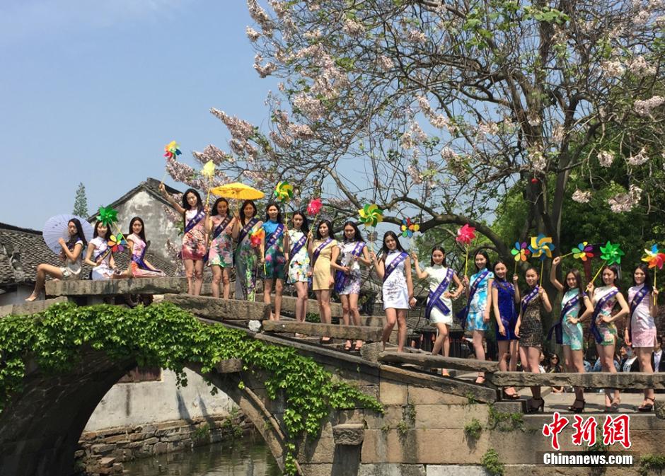 Yulia, Zhang Jinxiao and other supermodels appear in Zhouzhuang, east China's Jiangsu Province On April 23, 2015. Yulia is the winner of the World Super Model Contest Global Finals. (Chinanews.com/Huang Ying)