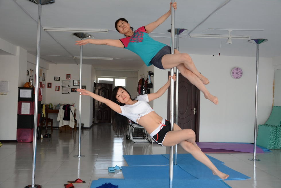 65-year-old Jiang Zhijun practices pole dancing with her daughter in Jilin, April 25, 2015. (Photo/China Youth Daily)
