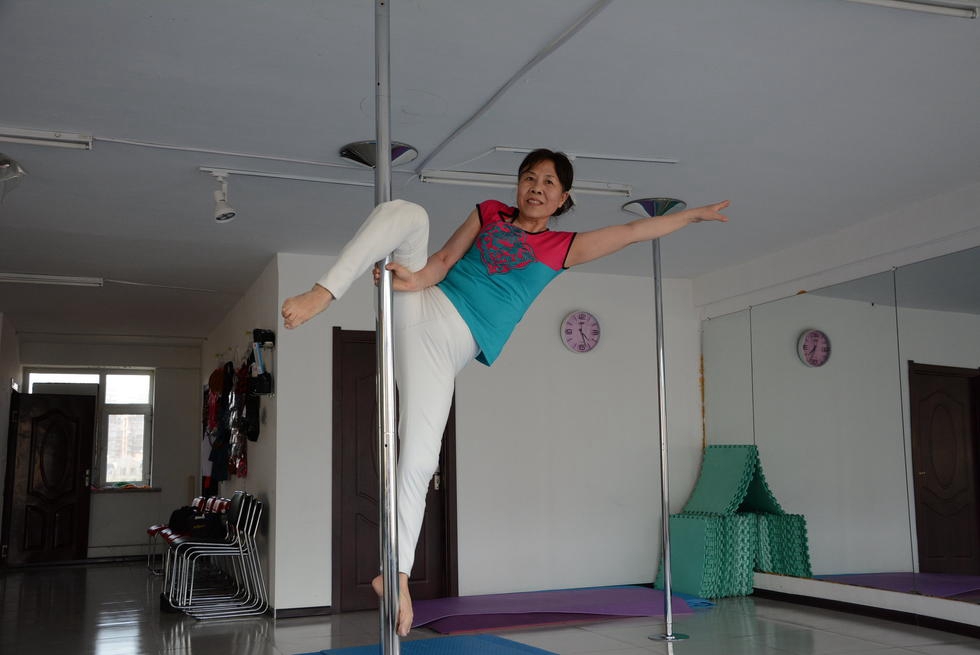 Two years ago, influenced by her daughter who is a pole dancing instructor, 65-year-old Jiang Zhijun started to learn pole dancing. Now she can even perform some difficult movements.