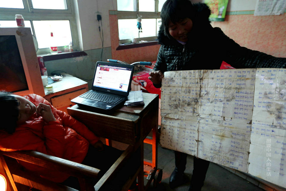 Guo Xiangge's mother shows the paper board Chinese phonetic alphabet that Guo used in her childhood. (Photo/Youth.cn)