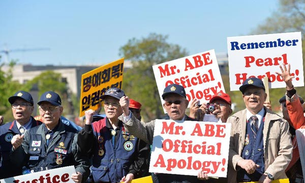 While U.S. President Barack Obama held talks with the Japanese Prime Minister at the White House Tuesday, nearly two hundred people held signs and shouted slogans in a protest a few blocks away against Abe's handling of history issues, demanding the Japanese leader to unequivocally apologize for his country's wartime crimes.