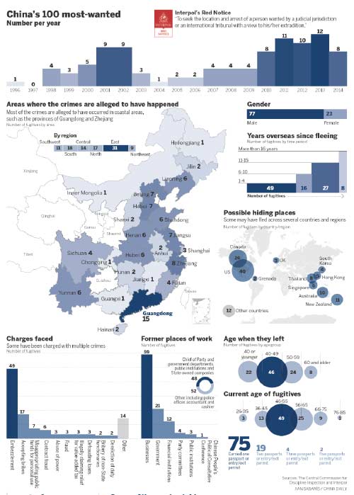 "Most of the 100 most-wanted are former officials accused of graft," said Huang Feng, law professor at Beijing Normal University, adding that most of the cases relate to allegations of corruption.
