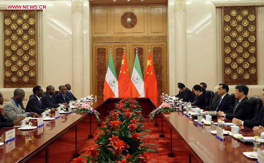Chinese Premier Li Keqiang (3rd R) meets with President of Equatorial Guinea Teodoro Obiang Nguema Mbasogo (3rd L) in Beijing, capital of China, April 29, 2015. (Xinhua/Liu Weibing)