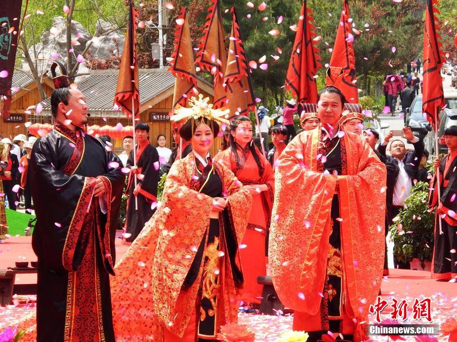 About 100 couples hold a Han-style group wedding at Laojunshan Mountain, central China's Henan province, April 26, 2015. Located in Luanchuan county, Laojunshan Mountain is famous for its rich Taoist culture and wonderful scenery. (CNS/Cao Fuchuan) |