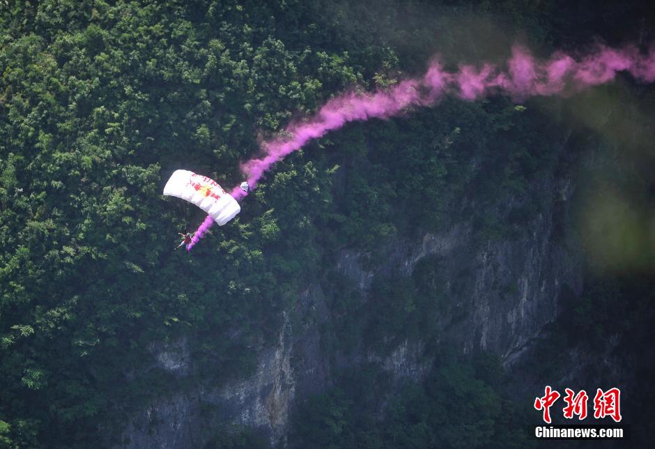 On April 26, 2015, the world's top wingsuit enthusiast Miles and China's No.1 wingsuit enthusiast Xu Kai perform low-altitude parachuting at the world's longest cantilever bridge in the Longgang Scenic Zone of Yunyang county, southwest China’s Chongqing. The bridge was officially opened to the public on the day. (CNS Photo)