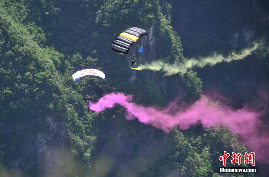 On April 26, 2015, the world's top wingsuit enthusiast Miles and China's No.1 wingsuit enthusiast Xu Kai perform low-altitude parachuting at the world's longest cantilever bridge in the Longgang Scenic Zone of Yunyang county, southwest China’s Chongqing. The bridge was officially opened to the public on the day. (CNS Photo) |
