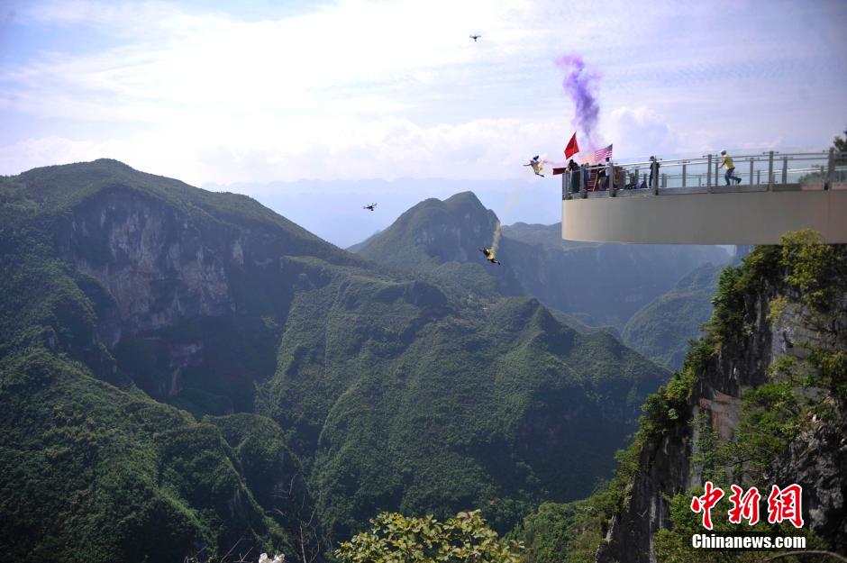 On April 26, 2015, the world's top wingsuit enthusiast Miles and China's No.1 wingsuit enthusiast Xu Kai perform low-altitude parachuting at the world's longest cantilever bridge in the Longgang Scenic Zone of Yunyang county, southwest China’s Chongqing. The bridge was officially opened to the public on the day. (CNS Photo)