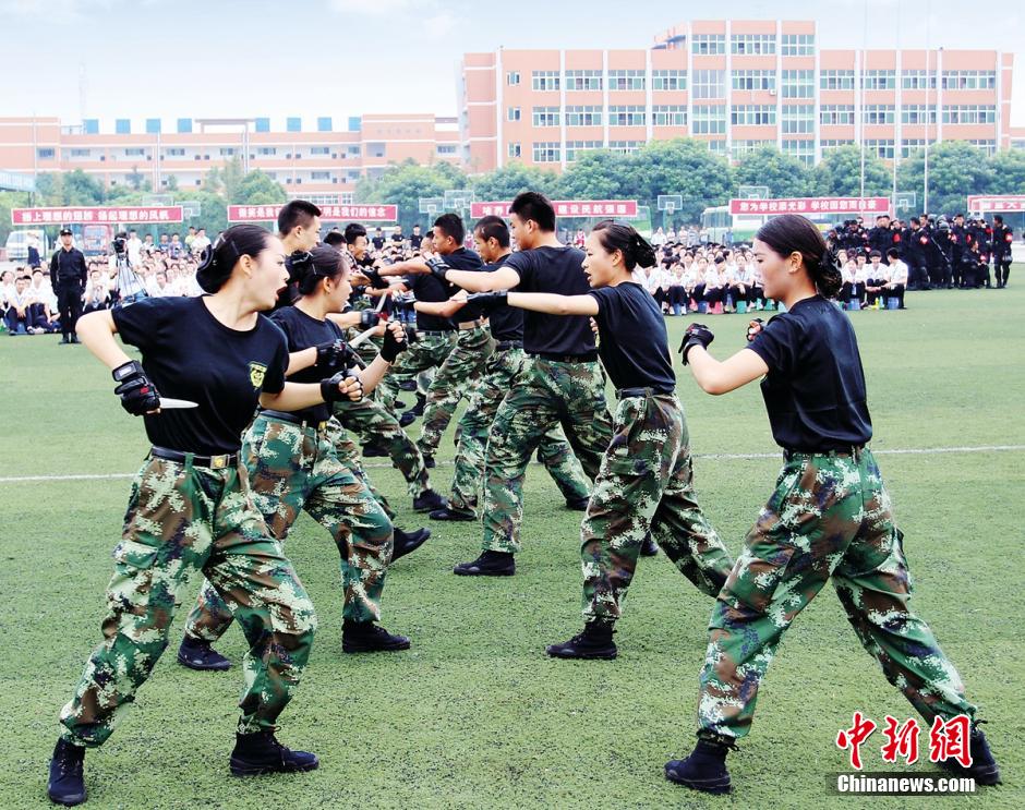 Students of the aviation major of an institute in Chengdu, Sichuan Province have intensified their training recently. Besides professional lessons such as etiquette, they learn catching and grappling. They are required to master the skill to break a bowl and cut a brick with one hand. The training aims to turn them to tough girls who can give the enemy a deadly blow in one hit. (CNS Photo) |