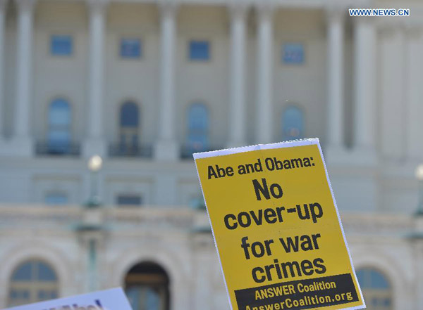 A protesters holds a sign in front of Capitol Hill as Japanese Prime Minister Shinzo Abe pays a visit to White House in Washington D.C., capital of the United States, April 28, 2015. Nearly 200 people held signs and shouted slogans in a protest against Abe's handling of history issues, demanding the Japanese leader to unequivocally apologize for his country's wartime crimes here on Tuesday. (Xinhua/Bao Dandan) |