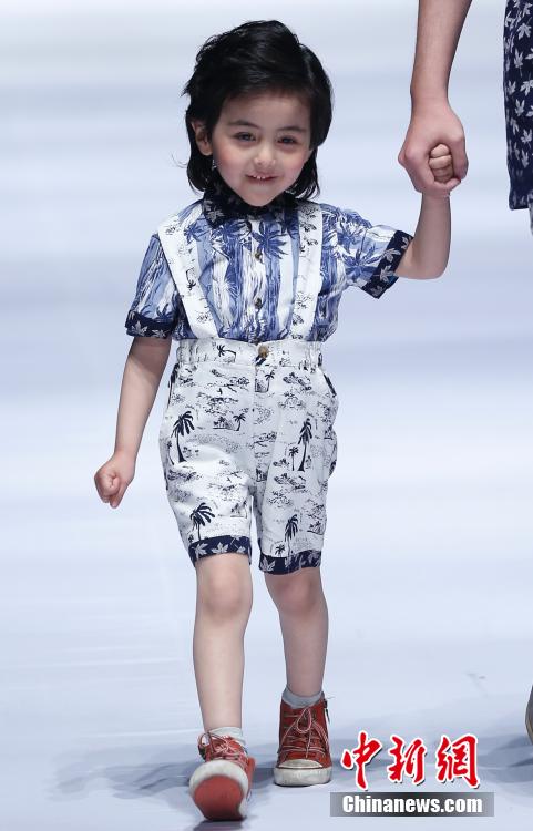 The cute child models present the clothes designed by Gui Long, a well-known fashion design house in Qingdao, east China's Shandong Province on April 26, 2015. At the 2015 Qingdao Fashion Week, Gui Long launched British-style clothing for children. (Chinanews.com/Sheng Jiapeng)