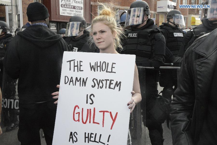 A protester holds a banner on North Ave in Baltimore, Maryland, the United States, April 28, 2015. U.S. President Barack Obama said on Tuesday there was no excuse for that kind of violence that occurred in Baltimore in the past days, calling for the country to do some "soul searching" as the race-related riots convulsed the largest city of U.S. State of Maryland. (Xinhua/Lu Jiafei)