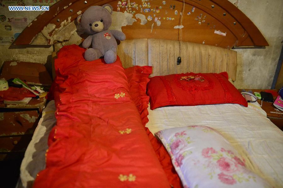 Photo taken on April 28, 2015 shows the red quilt used for the marriage of Yang Zubin and his wife Xu Yuelian at their house in Jishui County, east China's Jiangxi Province. Yang Zubin and Xu Yuelian, both 34 years old, are a couple in Nanpo Village of Huangqiao Township in Jishui County of Jiangxi Province. Yang survived a severe traffic accident and ended up in vegetative state in 2012. Though being beset by perils, Xu didn't give up on her husband and her family. With Xu's utmost care, Yang opened his eyes and regained some of his consciousness in 2014, which is rare in such circumstances. The couple who have shared weal and woe are still hoping for miracles to happen. (Xinhua/Zhou Mi)