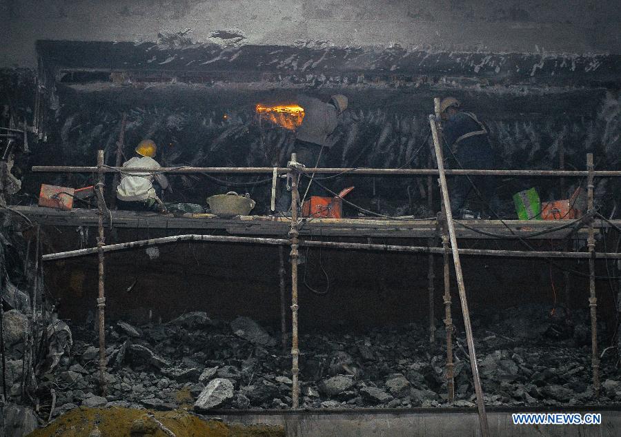 Laborers work at the construction site of the intersection of subway lines 1 and 2 in Changchun, capital of northeast China's Jilin Province, April 29, 2015. Changchun's 18.5-kilometer north-to-south subway line 1 is expected to be put into use in 2016. And the 22.8-kilometer line 2 is an east-to-west passage with 19 stations, 13 of which are under construction. (Xinhua/Xu Chang)