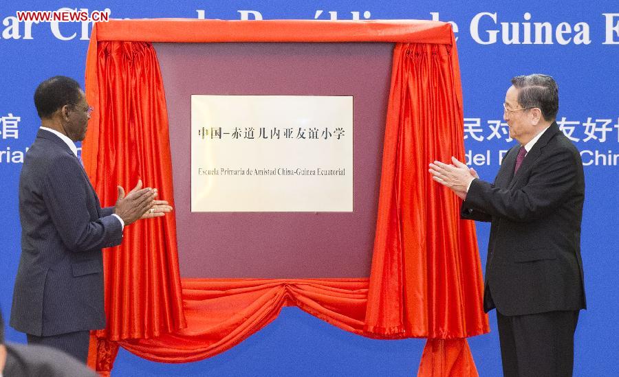 Yu Zhengsheng (R), chairman of the National Committee of the Chinese People's Political Consultative Conference (CPPCC), and Equatorial Guinea's President Teodoro Obiang Nguema Mbasogo inaugurate the Sino-Equatorial Guinea Friendship Primary School together during a reception celebrating the 45th anniversary of the establishment of diplomatic relations between China and Equatorial Guinea in Beijing, capital of China, April 29, 2015. (Xinhua/Huang Jingwen)