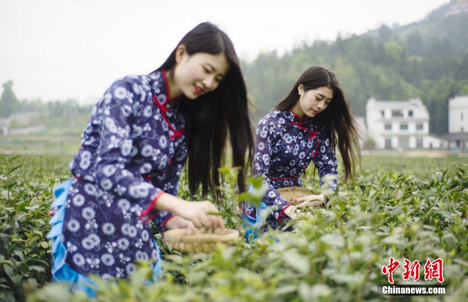 Models dressed in cheongsams pick the tea leaves in a tea plantation in Mount Wei, central China's Hunan province on the Monday. (Chinanews.com/Yang Huafeng)