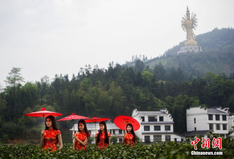 Models dressed in cheongsams pick the tea leaves in a tea plantation in Mount Wei, central China's Hunan province on the Monday. (Chinanews.com/Yang Huafeng)