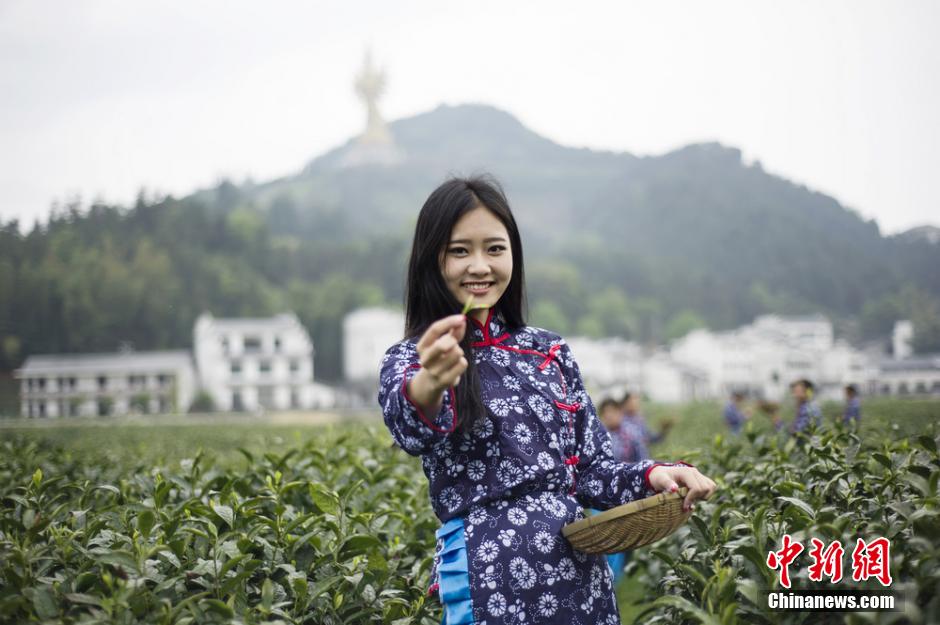 Models dressed in cheongsams pick the tea leaves in a tea plantation in Mount Wei, central China's Hunan province on the Monday. (Chinanews.com/Yang Huafeng)