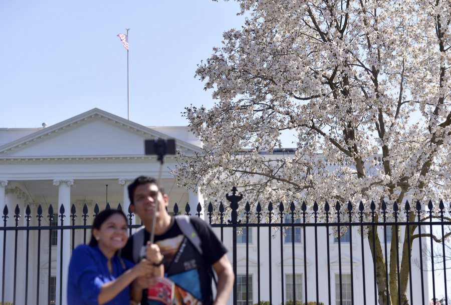 Tourists take photos with magnolia flower in front of the White House in the U.S. on April 6, 2015. (Xinhua/Yin Bogu)