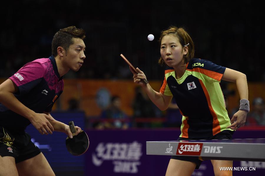 China's Xu Xin(L)/South Korea's Yang Haeun serve the ball during the Mixed Doubles match against Hong Kong China's Wong Chun Ting/Doo Hoi Kem at the 53rd Table Tennis World Championships in Suzhou, city of east China's Jiangsu Province, on April 30, 2015. Xu Xin/Yang Haeun won the match 4-1. (Xinhua/Song Zhenping) |