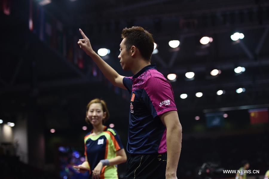 China's Xu Xin(R)/South Korea's Yang Haeun celebrate after winning the Mixed Doubles match against Hong Kong China's Wong Chun Ting/Doo Hoi Kem at the 53rd Table Tennis World Championships in Suzhou, city of east China's Jiangsu Province, on April 30, 2015. Xu Xin/Yang Haeun won the match 4-1. (Xinhua/Li Xiang) |