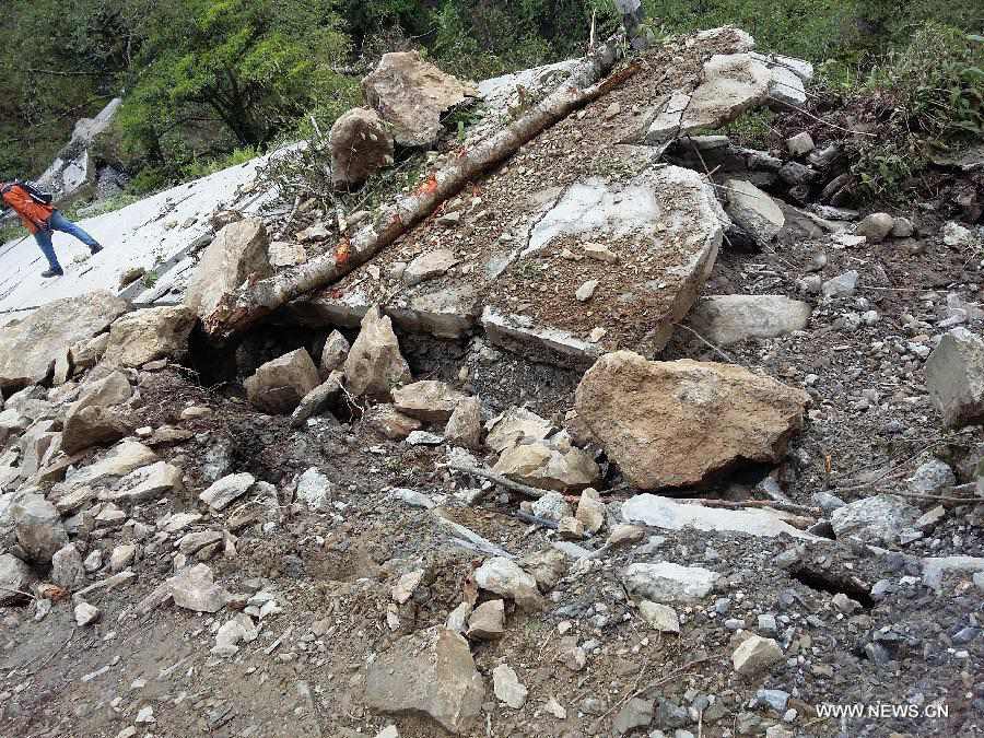 Photo taken on May 1, 2015 shows a damaged road in Rasuwa, Nepal. (Xinhua/Sunil Sharma) |