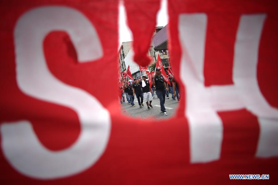 People hold banners and flags during the annual demonstration of the International Workers' Day in Panama City, capital of Panama, on May 1, 2015. (Xinhua/Mauricio Valenzuela)
