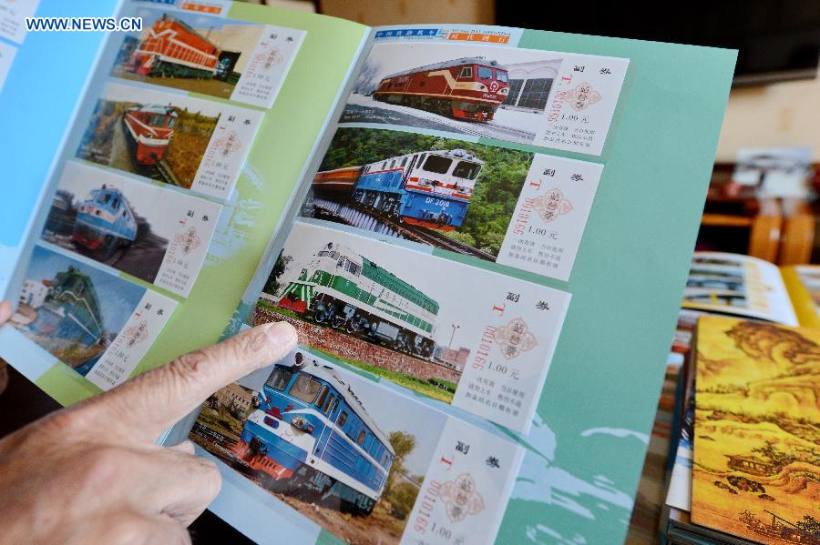 Xin Baozhong shows the train platform tickets he collected at home in Tangshan, north China's Hebei Province, May 2, 2105. Xin has collected over 1,800 train platform tickets from about 100 train stations all over China since 1999. (Xinhua/Mu Yu)