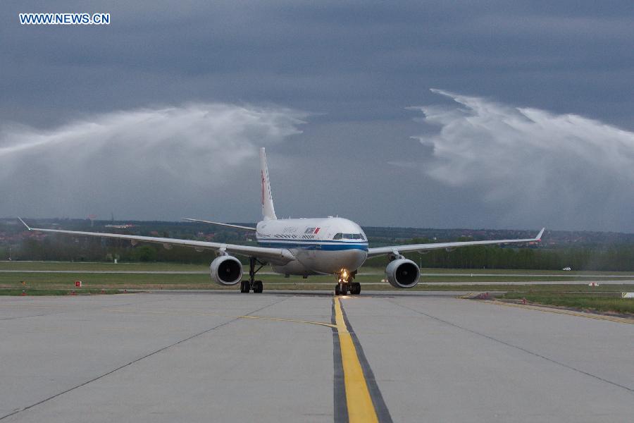 Budapest Ferenc Liszt International Airport greets Air China's first flight with an archway of water in Budapest, Hungary on May 1, 2015. Air China's Beijing-Budapest route was officially inaugurated on Friday evening, when its Airbus 330-200 landed at Budapest Ferenc Liszt International Airport. On the way to Budapest the flight stops once, in Minsk, Belarus, but the return trip from Budapest to Beijing is non-stop. (Xinhua/Attila Volgyi)