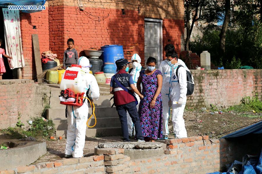Members of China Medical Team instruct local people in disinfecting skills in Kirtipur in Nepal, on May 2, 2015. As a responsible global power and Nepal's neighbor, China responded immediately to Nepal's call after the magnitude-7.9 quake hit Nepal, leaving more than 6,600 people dead and many more still missing. (Xinhua/Zhao Yishen) |