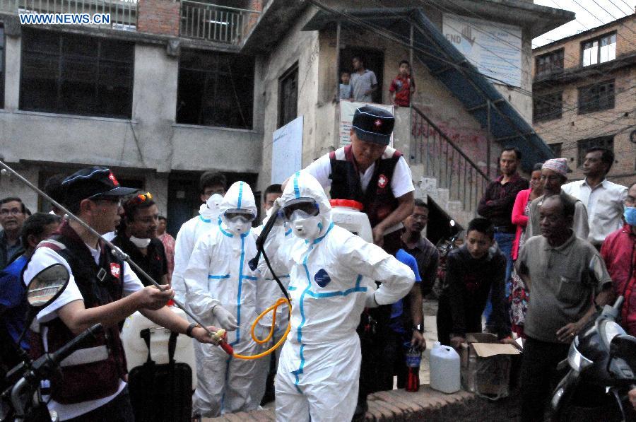 Members of China Medical Team instruct local people in disinfecting skills in Kirtipur in Nepal, on May 2, 2015. As a responsible global power and Nepal's neighbor, China responded immediately to Nepal's call after the magnitude-7.9 quake hit Nepal, leaving more than 6,600 people dead and many more still missing. (Xinhua/Zhao Yishen) |