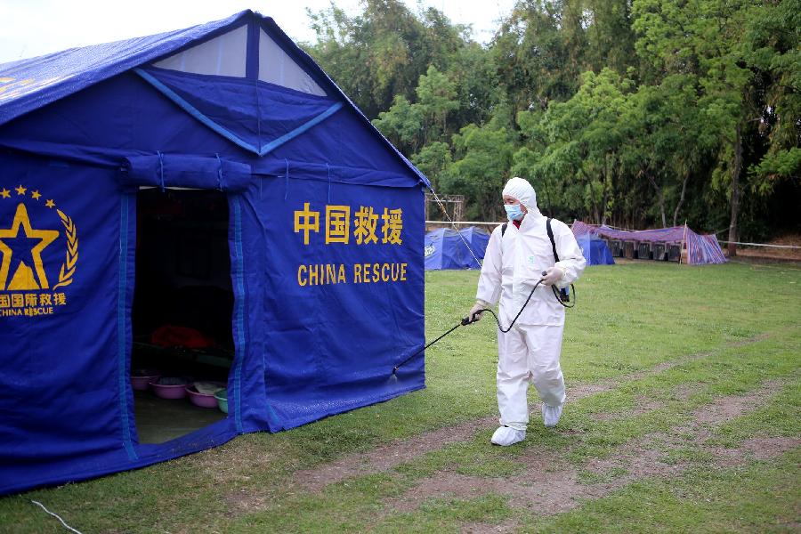 A member of China International Search and Rescue Team (CISAR) disinfects a tent in Nepal's capital Katmandu, May 1, 2015. A 62-member Chinese search and rescue team was among the first outside helpers to reach quake-hit areas in Nepal. (Xinhua/Bai Yang)