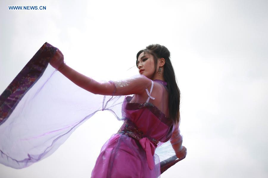A model displays the Hanfu, or Han dress, in Mang Dang Mountain Han Culture Tourism Area in Yongcheng City of central China's Henan Province, May 2, 2015. Hanfu is the traditional dress of the Han Chinese people. (Xinhua/Zheng Huansong)