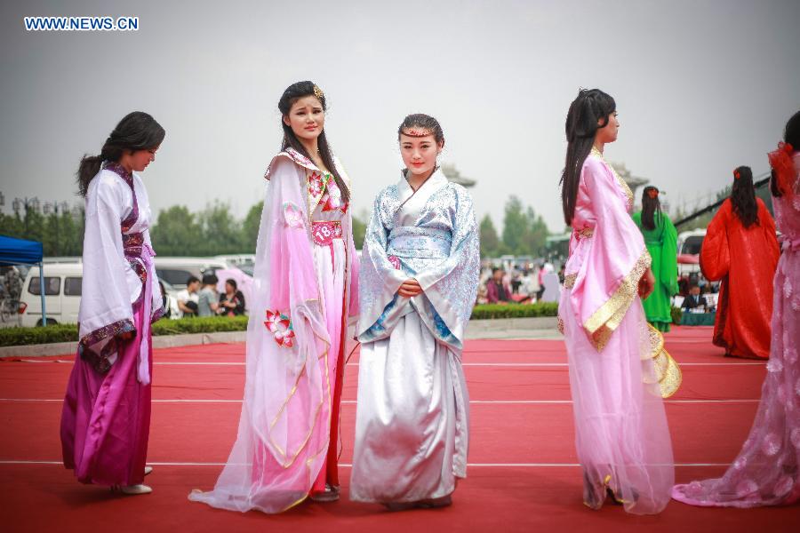 Models display the Hanfu, or Han dress, in Mang Dang Mountain Han Culture Tourism Area in Yongcheng City of central China's Henan Province, May 2, 2015. Hanfu is the traditional dress of the Han Chinese people. (Xinhua/Zheng Huansong)
