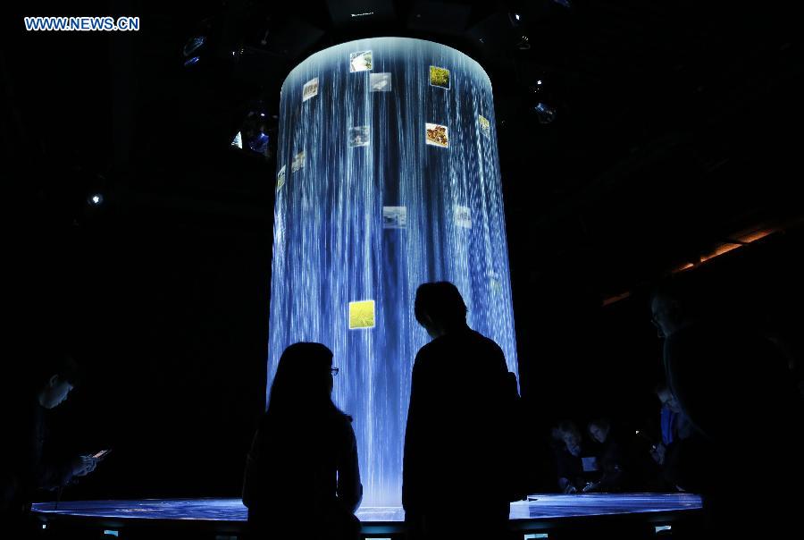 People enjoy lighting effects at Japan Pavilion at Milan Expo 2015 in Milan, Italy, May 3, 2015. The Milan Expo with the theme "Feeding the planet, Energy for life" will run until October 31 and is expected to attract over 20 million visitors. (Xinhua/Ye Pingfan)