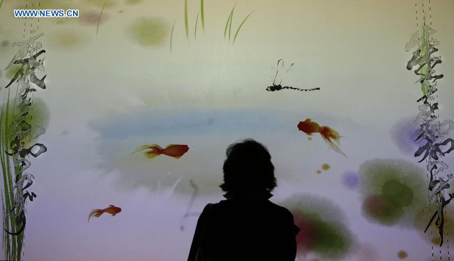 A visitor watches video demonstration at Japan Pavilion at Milan Expo 2015 in Milan, Italy, May 3, 2015. The Milan Expo with the theme "Feeding the planet, Energy for life" will run until October 31 and is expected to attract over 20 million visitors. (Xinhua/Ye Pingfan)