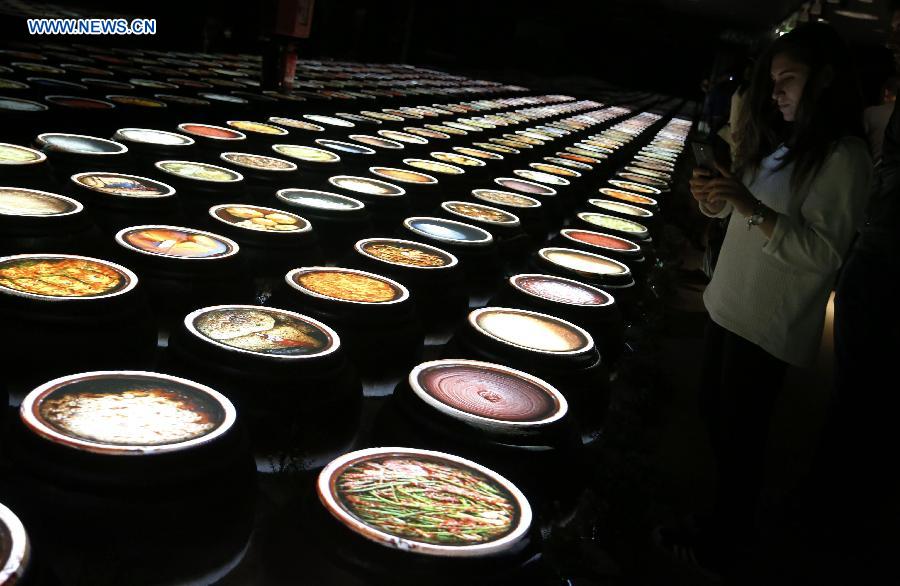 Visitors take photos at South Korea Pavilion at Milan Expo 2015 in Milan, Italy, May 3, 2015. The Milan Expo with the theme "Feeding the planet, Energy for life" will run until October 31 and is expected to attract over 20 million visitors. (Xinhua/Ye Pingfan)