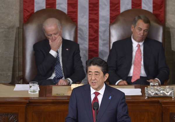 Japanese Prime Minister Shinzo Abe (C) addresses a joint meeting of Congress on Capitol Hill in Washington D.C., the United States, April 29, 2015. (Xinhua/Yin Bogu) |