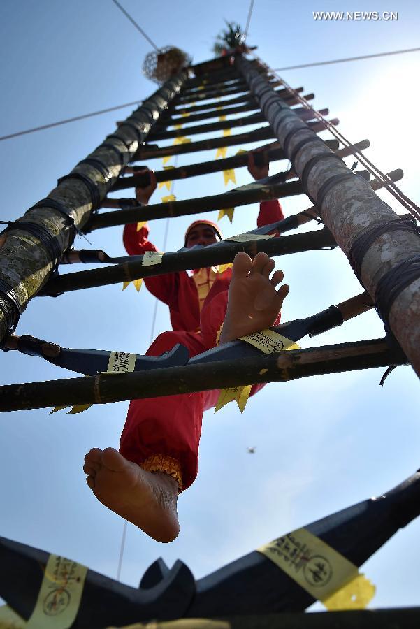 A man participates in folklore performance in Ding'an County of south China's Hainan Province, May 3, 2015. A series of local folklore activities called Naojunpo in Chinese is held in Ding'an Sunday. This folk custom of Hainan, which is in commemoration of an ancient heroine, is said to have a history of over 1300 years. (Xinhua/Guo Cheng)