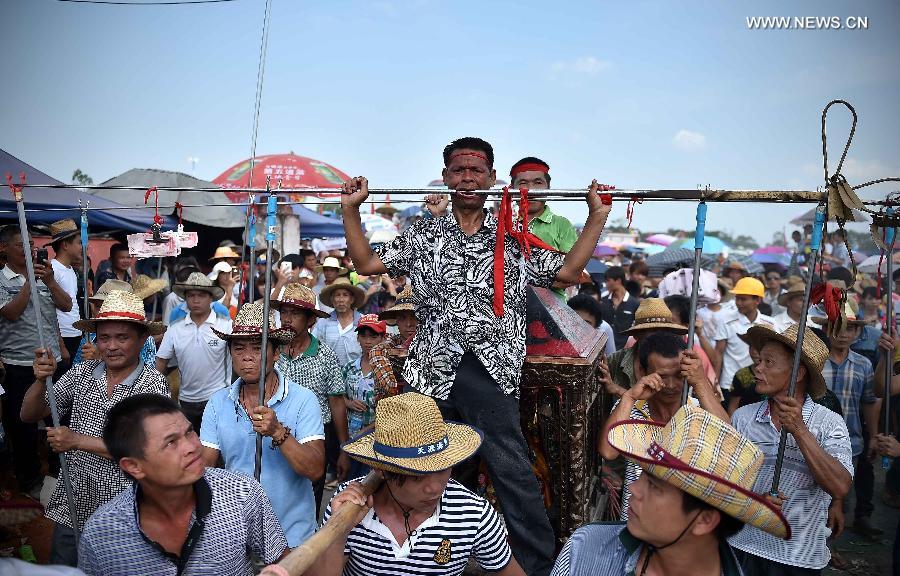 Local residents participate in folklore performance in Ding'an County of south China's Hainan Province, May 3, 2015. A series of local folklore activities called Naojunpo in Chinese is held in Ding'an Sunday. This folk custom of Hainan, which is in commemoration of an ancient heroine, is said to have a history of over 1300 years. (Xinhua/Guo Cheng)