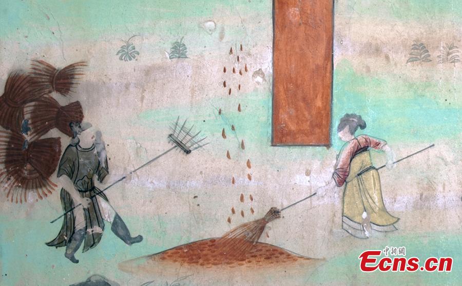 Dunhuang Research Academy has released a series of photos of grotto paintings that depict work scenes, such as farming, on WeChat, a popular social networking app, during the three-day May Day holiday. The academy is an institution responsible for conservation, management and research at the Mogao Grottoes (a World Cultural Heritage site at Dunhuang), the Yulin Grottoes (a nationally protected key cultural heritage site at Guazhou), and the Western Thousand-Buddha Grottoes at Dunhuang. (Photo provided by Dunhuang Research Academy)