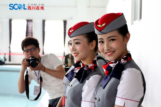 Two pairs of twin sisters are trained to be cabin attendants at the Sichuan Southwest College of Civil Aviation. Yan Huihui and Yan Cuicui are twin sisters; so are Yang Zhuojun and Yang Zhuolin. They have been recruited as cabin attendants by China Southern Airliners. (SCOL.com.cn/Yang De)