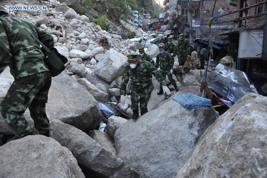 General Fu Ling (C) and soldiers of the traffic rescue brigade of China's Armed Police Force pass through a landslide area in Sindhupalchowk, Nepal, on May 4, 2015. China's armed police officers of traffic rescue left southwestern Tibet Autonomous Region and entered Nepal for the first time on Sunday to aid earthquake relief there. (Xinhua/Wen Tao)