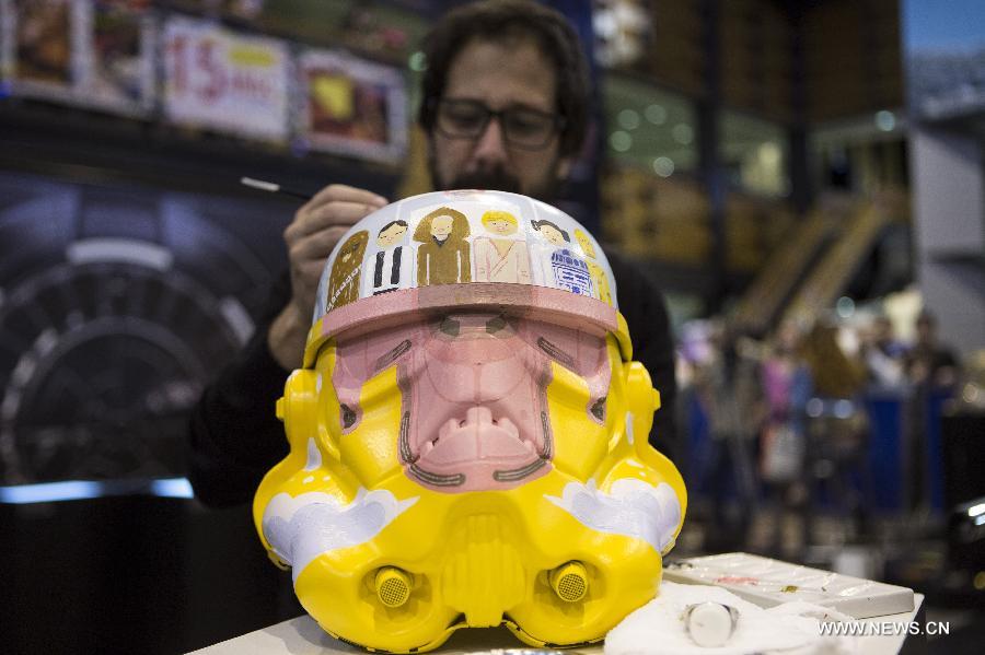 Illustrator Augusto Consthanzo works on a Stormtrooper helmet during the activity "Inspired by the Force", in the celebration of the "Star Wars Day", in Buenos Aires city, capital of Argentina, on May 4, 2015. (Xinhua/Martpin Zabala)