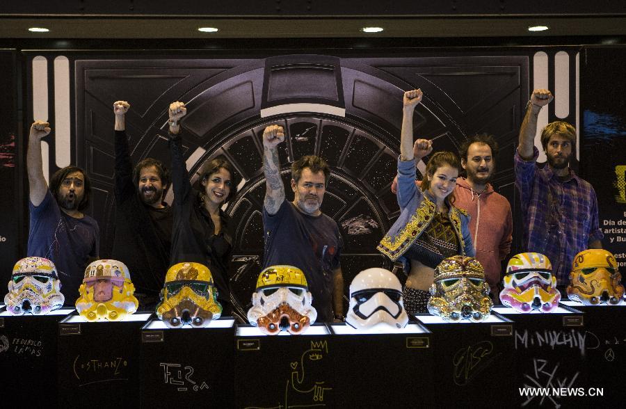 Argentine artists pose in front of their stormtrooper helmets during the activity "Inspired by the Force", in the celebration of the "Star Wars Day", in Buenos Aires city, capital of Argentina, on May 4, 2015. (Xinhua/Martpin Zabala)