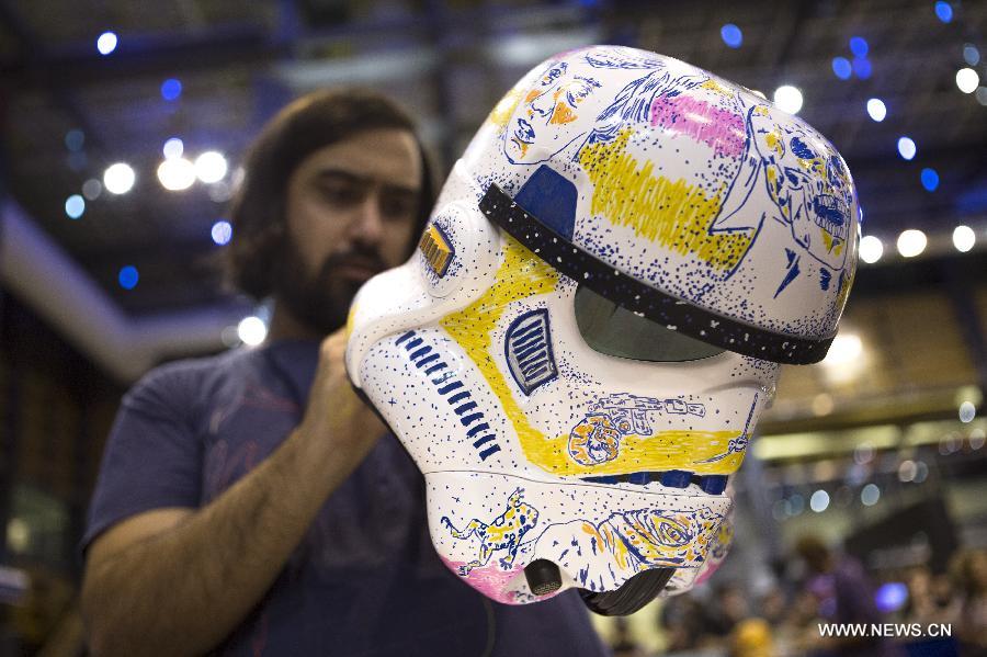 Illustrator Federico Lamas works on a Stormtrooper helmet during the activity "Inspired by the Force", in the celebration of the "Star Wars Day", in Buenos Aires city, capital of Argentina, on May 4, 2015.(Xinhua/Martpin Zabala)