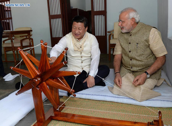 Chinese President Xi Jinping (L) rotates a spinning wheel that was once used by Mahatma Gandhi as he visits Gandhi's former residence along with Indian Prime Minister Narendra Modi (R) in Gujarat, India, Sept. 17, 2014. (xinhua) |