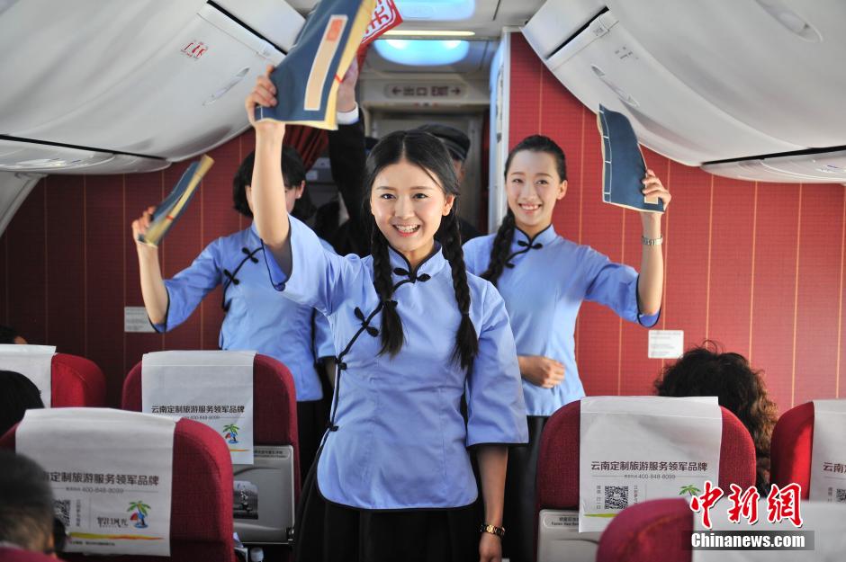 On the fight from Kunming to Sanya, Lucky Air stewardesses dressed in vintage school uniforms celebrate the Youth Day on May 4, 2015. (CNS/ Liu Ranyang)