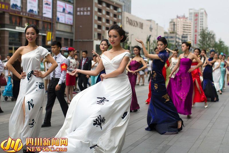 More than 20 future flight attendants stage a flash mob show in Chengdu, capital of southwest China's Sichuan province, May 3, 2015. (Photo/newssc.org)