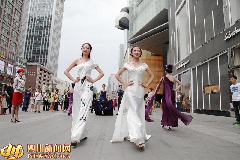 More than 20 future flight attendants stage a flash mob show in Chengdu, capital of southwest China's Sichuan province, May 3, 2015. They displayed traditional Chinese clothing and calligraphy, aiming to celebrate China's Youth day that falls on May 4 every year.